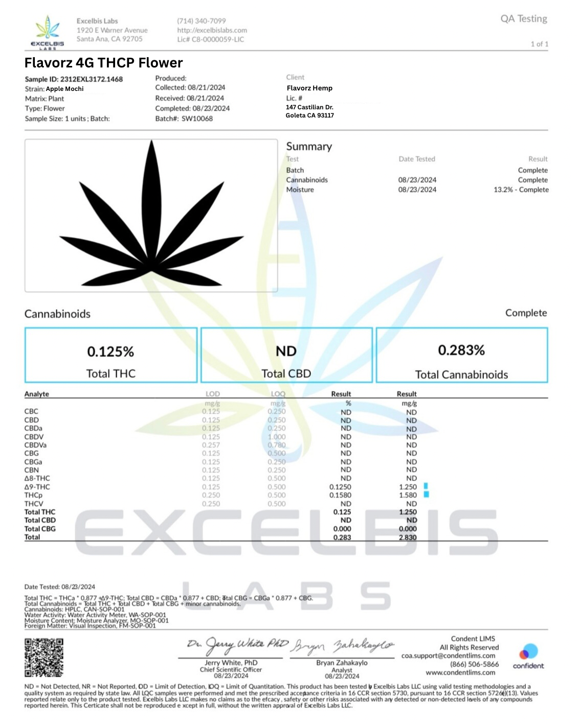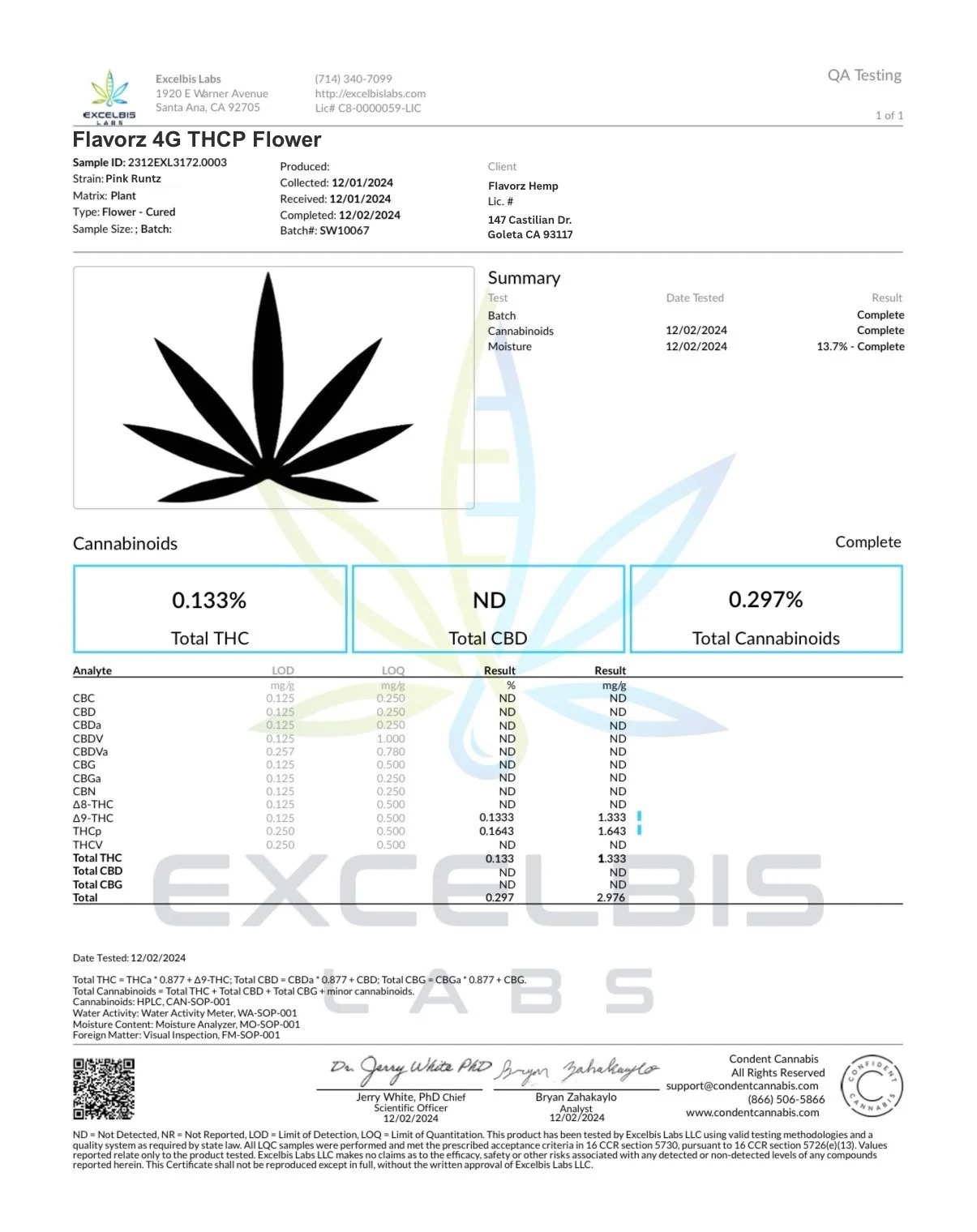 Lab test result for a cannabis flower with detailed cannabinoid analysis on a white background.